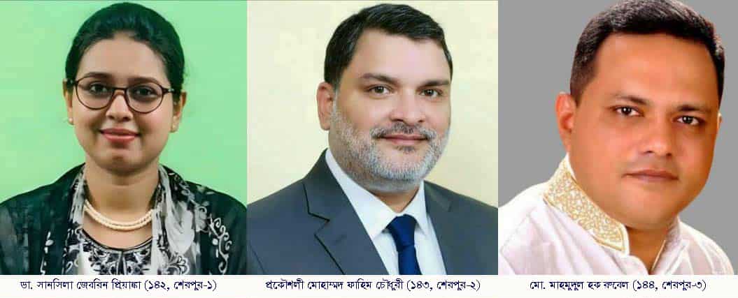 ঘোষণা অনুযায়ী, শেরপুর জেলার ৩টি আসনে মনোনয়ন পেলেন যারা তারা হলেন, সংসদীয় আসন ১৪২ শেরপুর-১ (সদর উপজেলা) আসনে ডা. সানসিলা জেবরিন প্রিয়াঙ্কা, সংসদীয় আসন ১৪৩ শেরপুর-২ (নকলা ও নালিতাবাড়ী উপজেলা) আসনে প্রকৌশলী মোহাম্মদ ফাহিম চৌধুরী ও সংসদীয় আসন ১৪৪ শেরপুর-৩ (শ্রীবরদী ও ঝিনাইগাতী উপজেলা) আসনে মো. মাহমুদুল হক রুবেল।