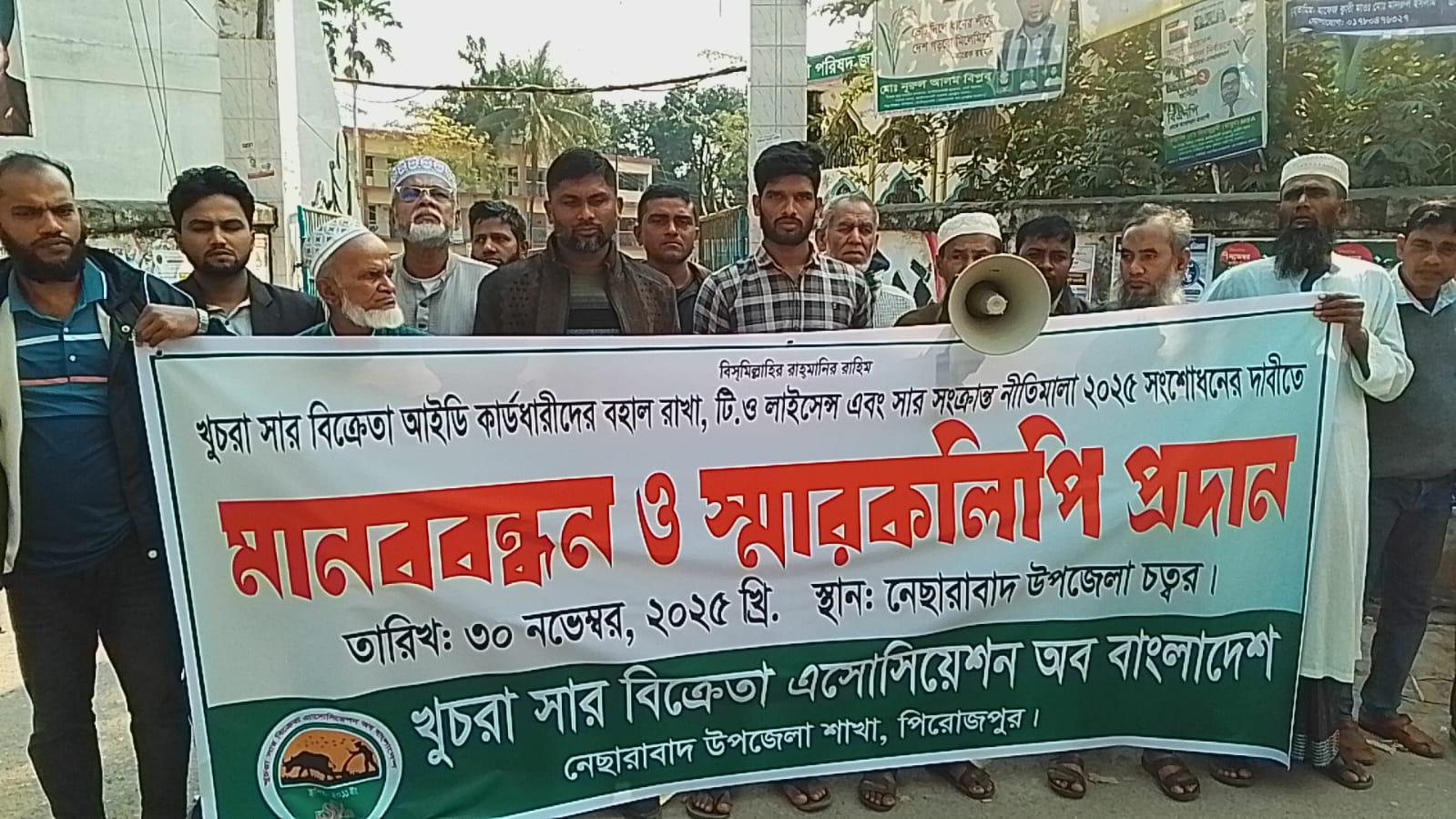 পিরোজপুরের নেছারাবাদ উপজেলায় খুচরা সার বিক্রেতা আইডি কার্ডধারীদের বহাল রাখা এবং টিও লাইসেন্স ও সার সংক্রান্ত নীতিমালা ২০২৫ সংশোধনের দাবিতে মানববন্ধন ও স্মারকলিপি প্রদান অনুষ্ঠিত হয়েছে।