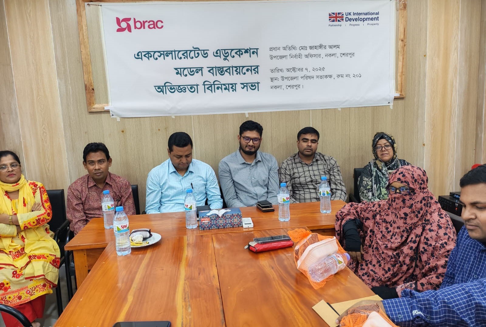 শেরপুরের নকলায় ব্র্যাক শিক্ষা কর্মসূচির আওতাধীন ব্র্যাক একসেলারেটেড এডুকেশন মডেল বাস্তবায়নের লক্ষ্যে স্থথানীয় সুধীজন ও অংশীজনের সমন্বয়ে অভিজ্ঞতা বিনিময় সভা অনুষ্ঠিত হয়েছে।