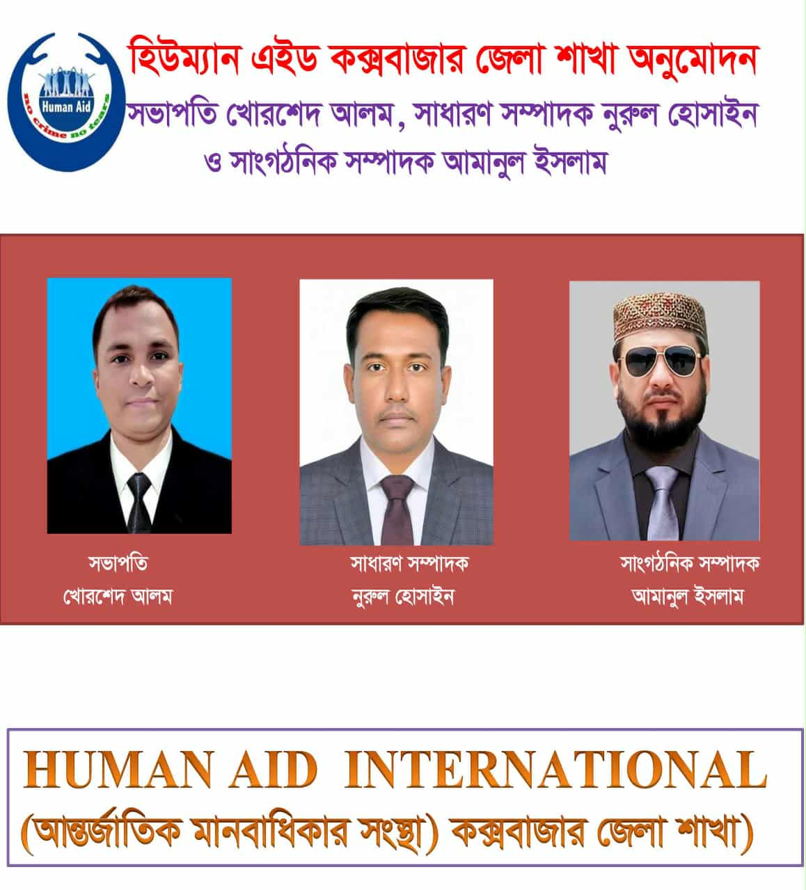 HUMAN AID INTERNATIONAL (আন্তর্জাতিক মানবাধিকার সংস্থা) কক্সবাজার জেলা শাখার সভাপতি খোরশেদ আলম,সাধারন সম্পাদক নুরুল হোসাইন ও সাংগঠনিক সম্পাদক আমানুল ইসলাম করে ১৯ সদস্য বিশিষ্ট কক্সবাজার জেলা শাখার পূর্ণাঙ্গ কমিটি অনুমোদিত হয়েছে।