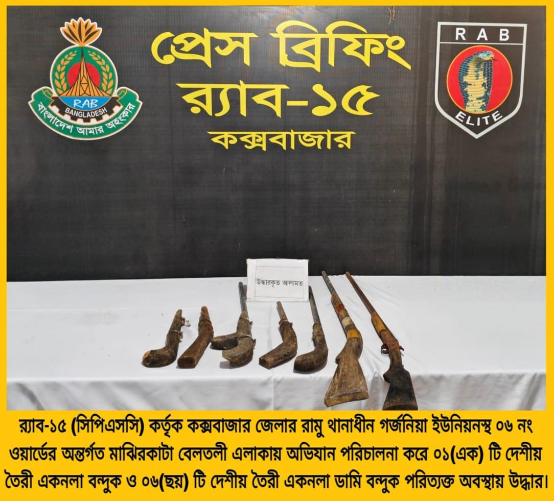 গর্জনিয়া ইউনিয়নের মাঝিরকাটা-বেলতলী এলাকায় বিশেষ অভিযান চালিয়েছে র্যাব-১৫।বৃহস্পতিবার (১৬ অক্টোবর) দুপুরে কক্সবাজার র্যাব-১৫ এর একটি অভিযানিক দল এ অভিযান পরিচালনা করে। এসময় ১টি দেশীয় তৈরী একনলা বন্দুক ও ৬টি দেশীয় তৈরী একনলা ডামি বন্দুক উদ্ধার করা হয়।