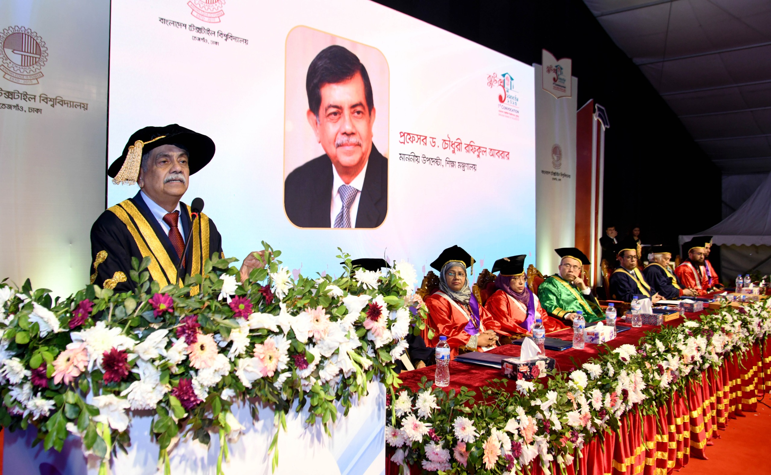 সমাবর্তন অনুষ্ঠানে সভাপতির বক্তব্যে শিক্ষা উপদেষ্টা অধ্যাপক ড. সি আর আবরার বলেন, “অল্প সময়ের মধ্যেই বাংলাদেশ টেক্সটাইল বিশ্ববিদ্যালয় প্রমাণ করেছে যে বিশেষায়িত শিক্ষা, গবেষণা ও উদ্ভাবনের মাধ্যমে একটি প্রতিষ্ঠান কীভাবে জাতীয় অর্থনীতির গুরুত্বপূর্ণ চালিকাশক্তিতে পরিণত হতে পারে। তিনি উল্লেখ করেন, বুটেক্স আজ বস্ত্র ও পোশাকশিল্পের জন্য দক্ষ, সৎ ও নেতৃত্বগুণসম্পন্ন মানবসম্পদ তৈরির একটি নির্ভরযোগ্য কেন্দ্র।”
