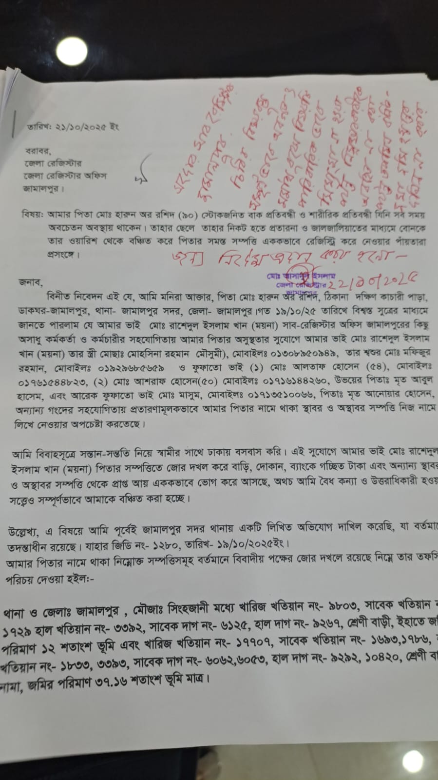 এর পর ২২ অক্টোবর ২০২৫ জেলা রেজিস্ট্রার, জামালপুর বরাবর লিখিত অভিযোগ দাখিল করি। অভিযোগের প্রেক্ষিতে জেলা রেজিস্ট্রার লাল কালি দ্বারা লিখিতভাবে নির্দেশ দেন যে,“বিষয়টি