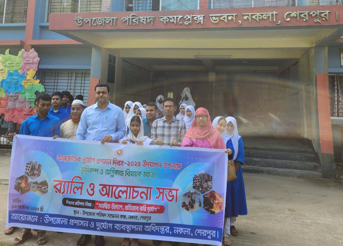 শেরপুরের নকলায় আন্তর্জাতিক দুর্যোগ প্রশমন দিবস-২০২৫ উদযাপন উপলক্ষ্যে ভূমিকম্প ও অগ্নিকান্ড বিষয়ক মহড়া এবং র্যালি ও আলোচনা সভা অনুষ্ঠিত হয়েছে। ‘সমন্বিত উদ্যোগ, প্রতিরোধ করি দুর্যোগ’ এই প্রতিপাদ্য বিষয়কে সামনে রেখে সোমবার উপজেলা প্রশাসন ও দুর্যোগ ব্যবস্থাপনা অধিদপ্তরের যৌথ আয়োজনে উপজেলা পরিষদ কমপ্লেক্সের সামনে থেকে র্যালি শুরু হয়ে গুরুত্বপূর্ণ সড়ক প্রদক্ষিন করে একই স্থানে গিয়ে শেষ হয়।