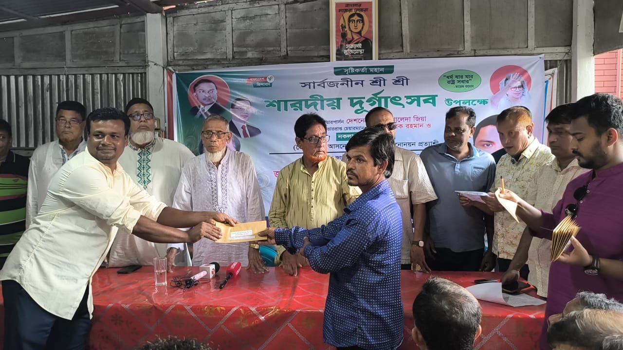 নকলায় বিভিন্ন পূজা মণ্ডপে ফাহিম চৌধুরীর নগদ অর্থ উপহার প্রদান